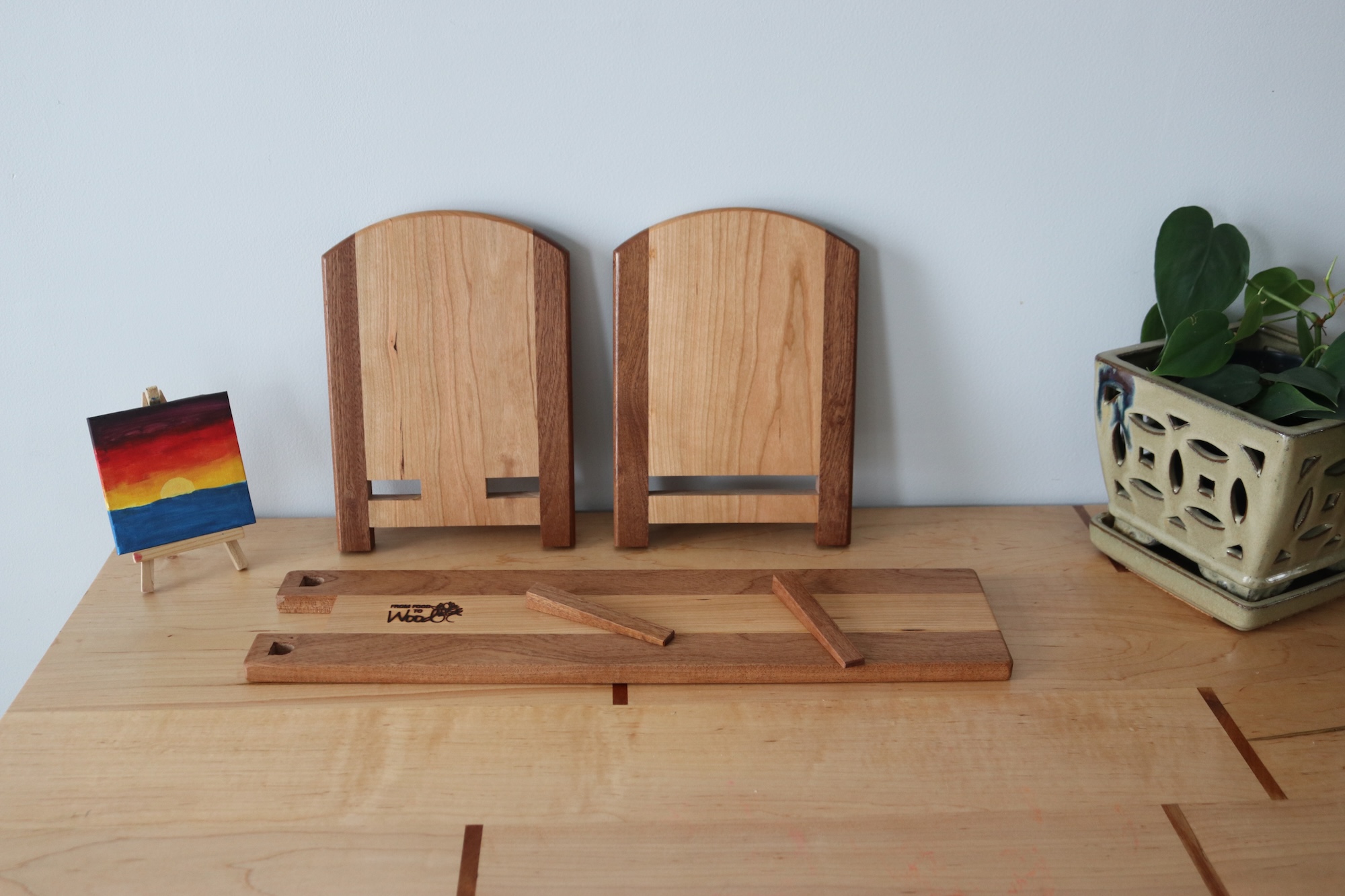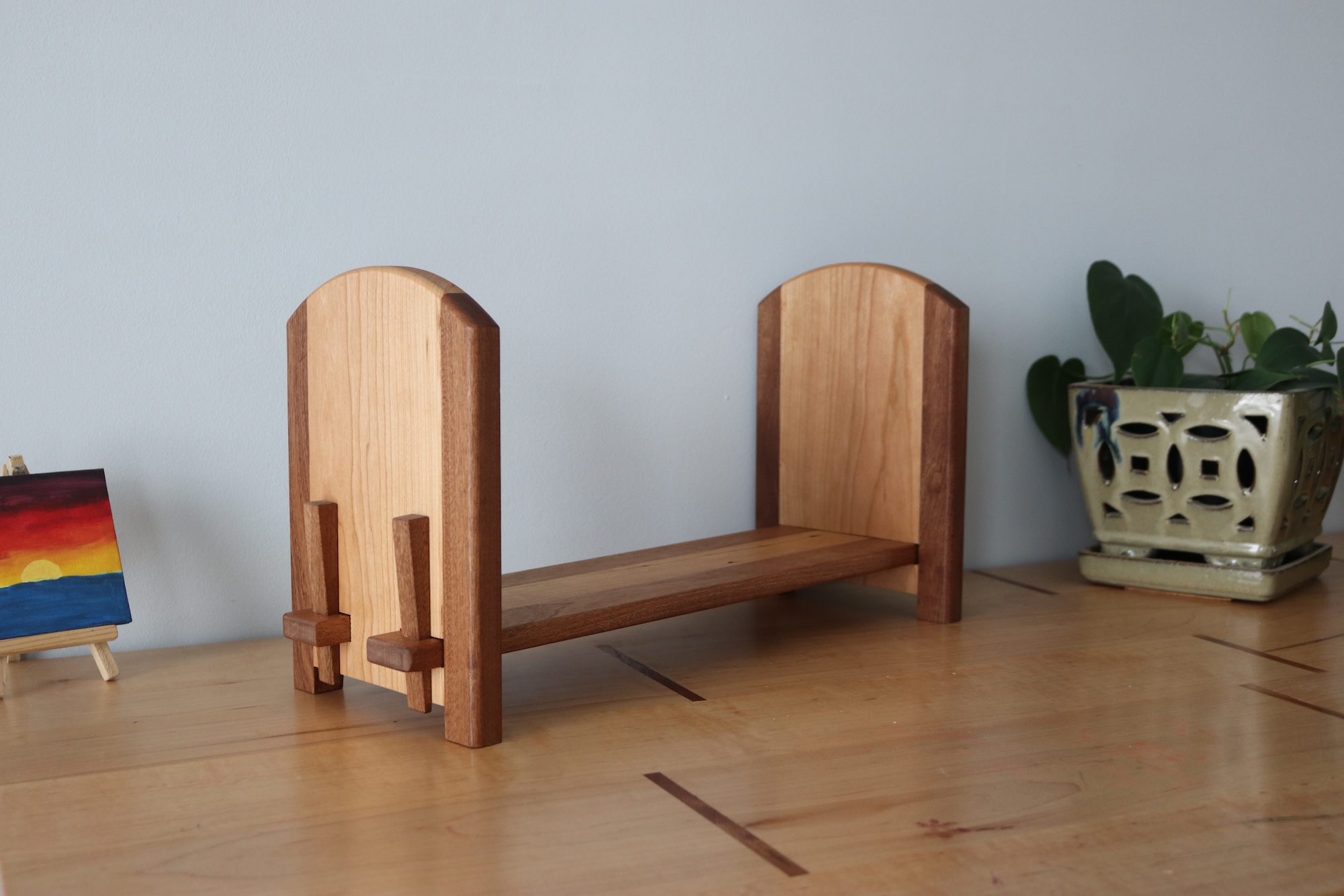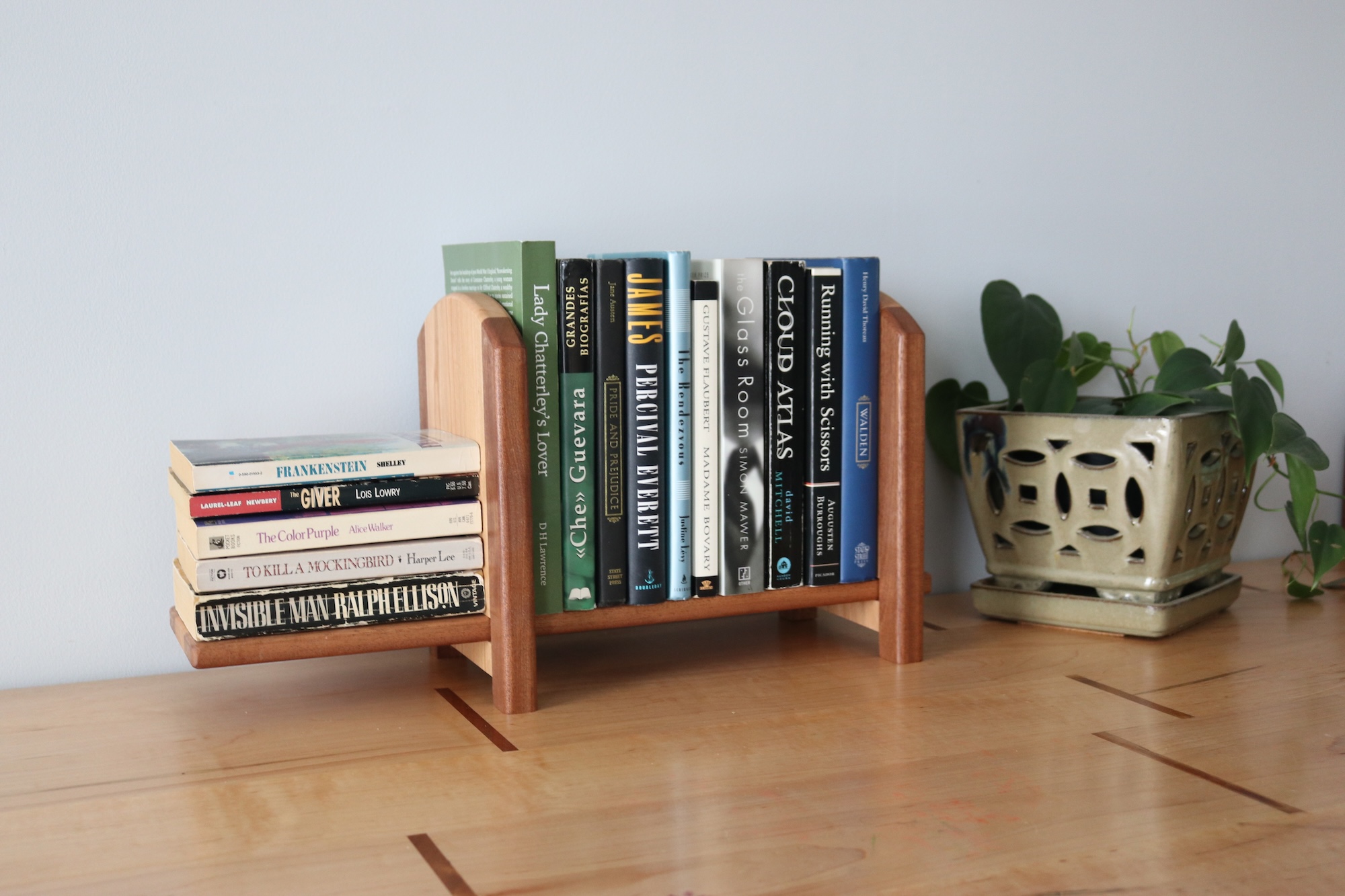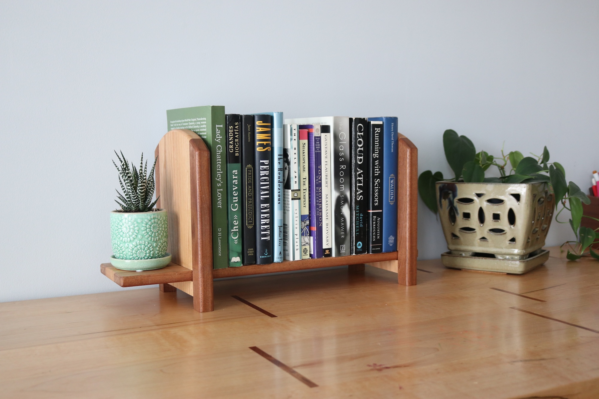 Designed for readers who like things tidy—but flexible. This handcrafted tabletop bookshelf features one fixed bookend and one sliding bookend, allowing you to easily adjust the width to fit your current stack of books. Whether you’re organizing a few favorites or a growing collection, this shelf adapts as your needs change.