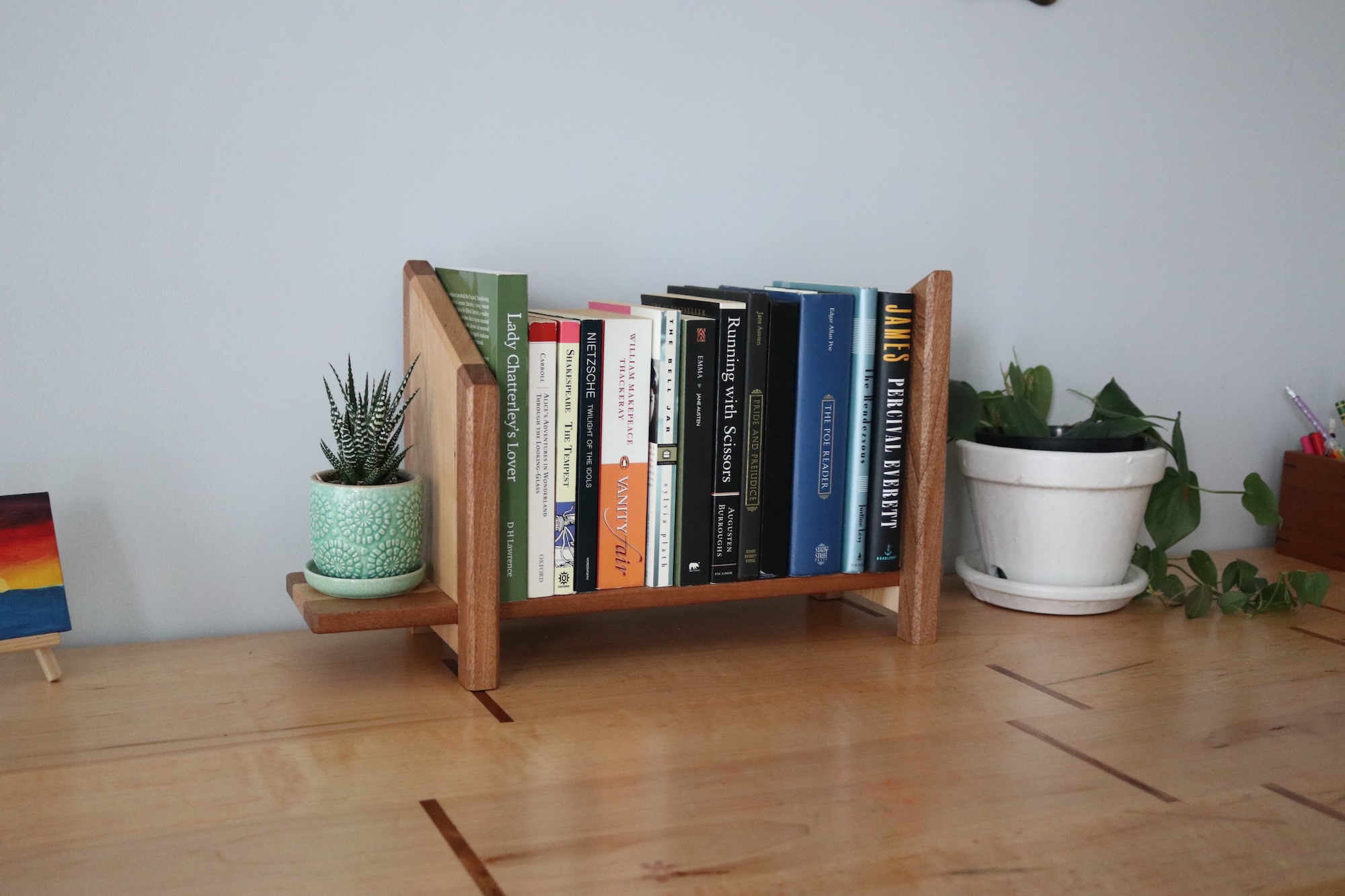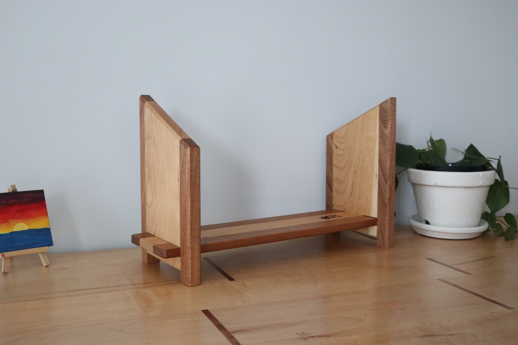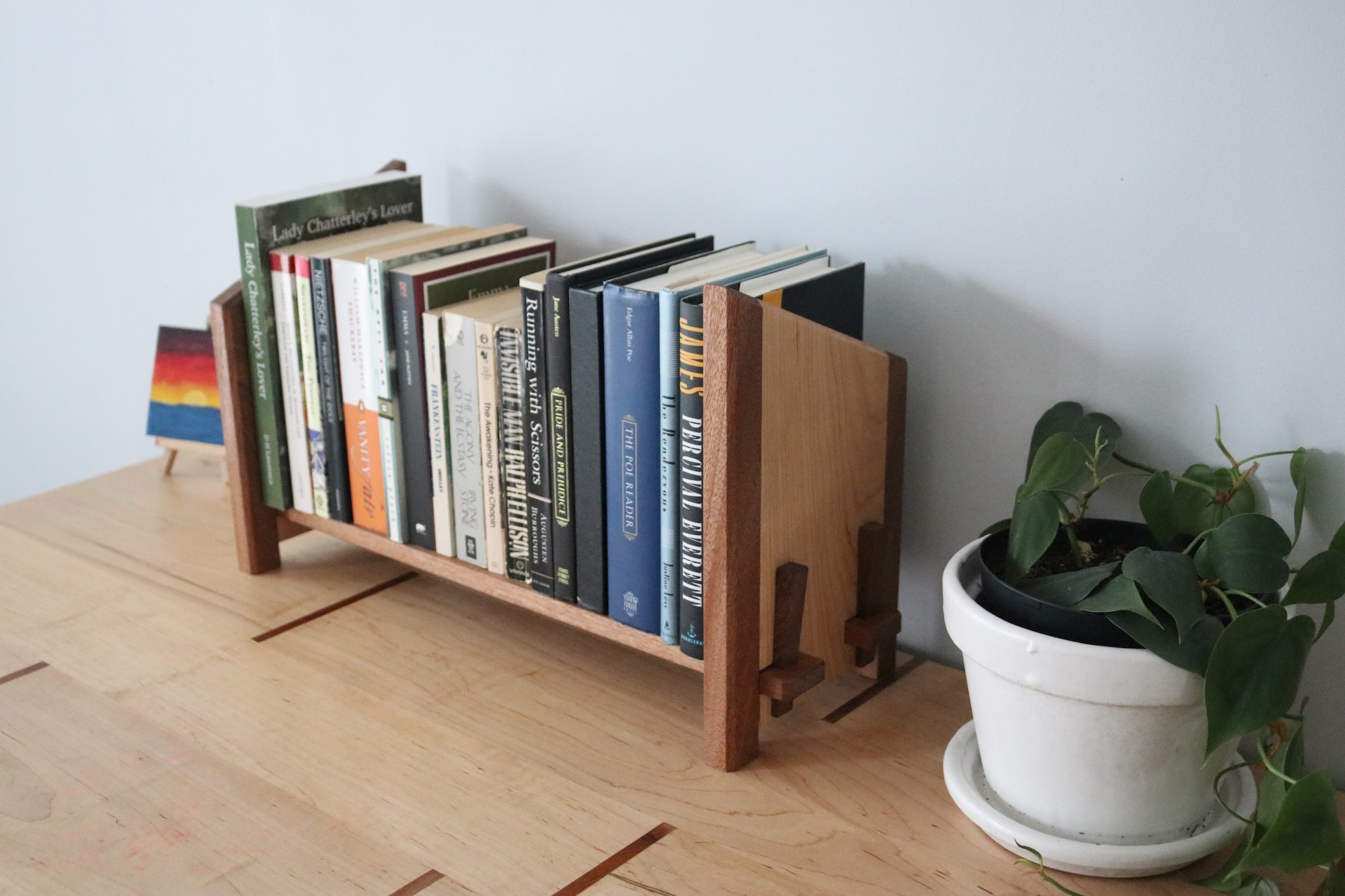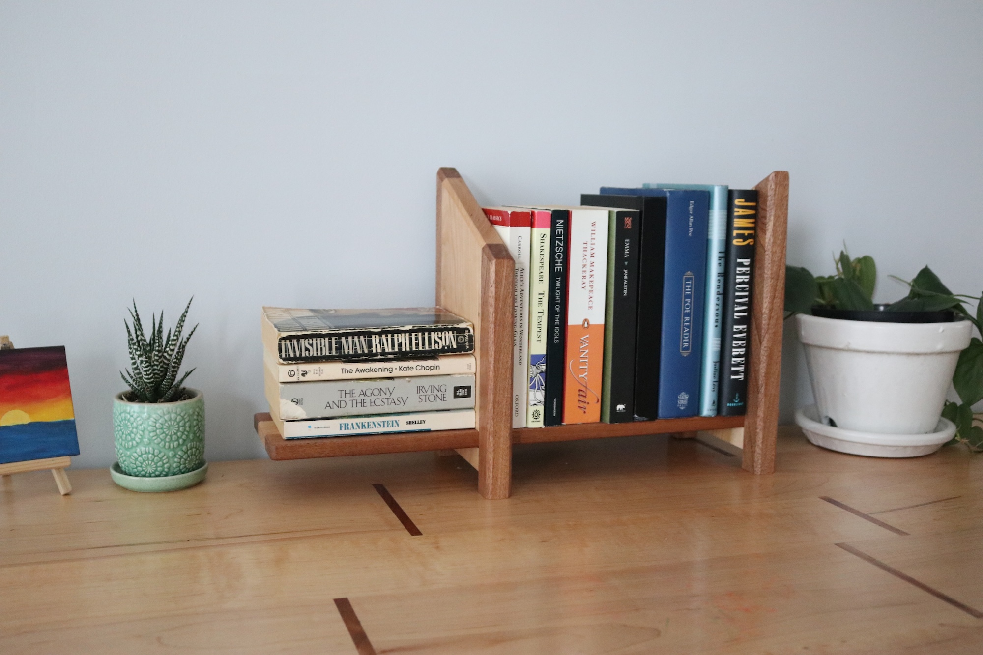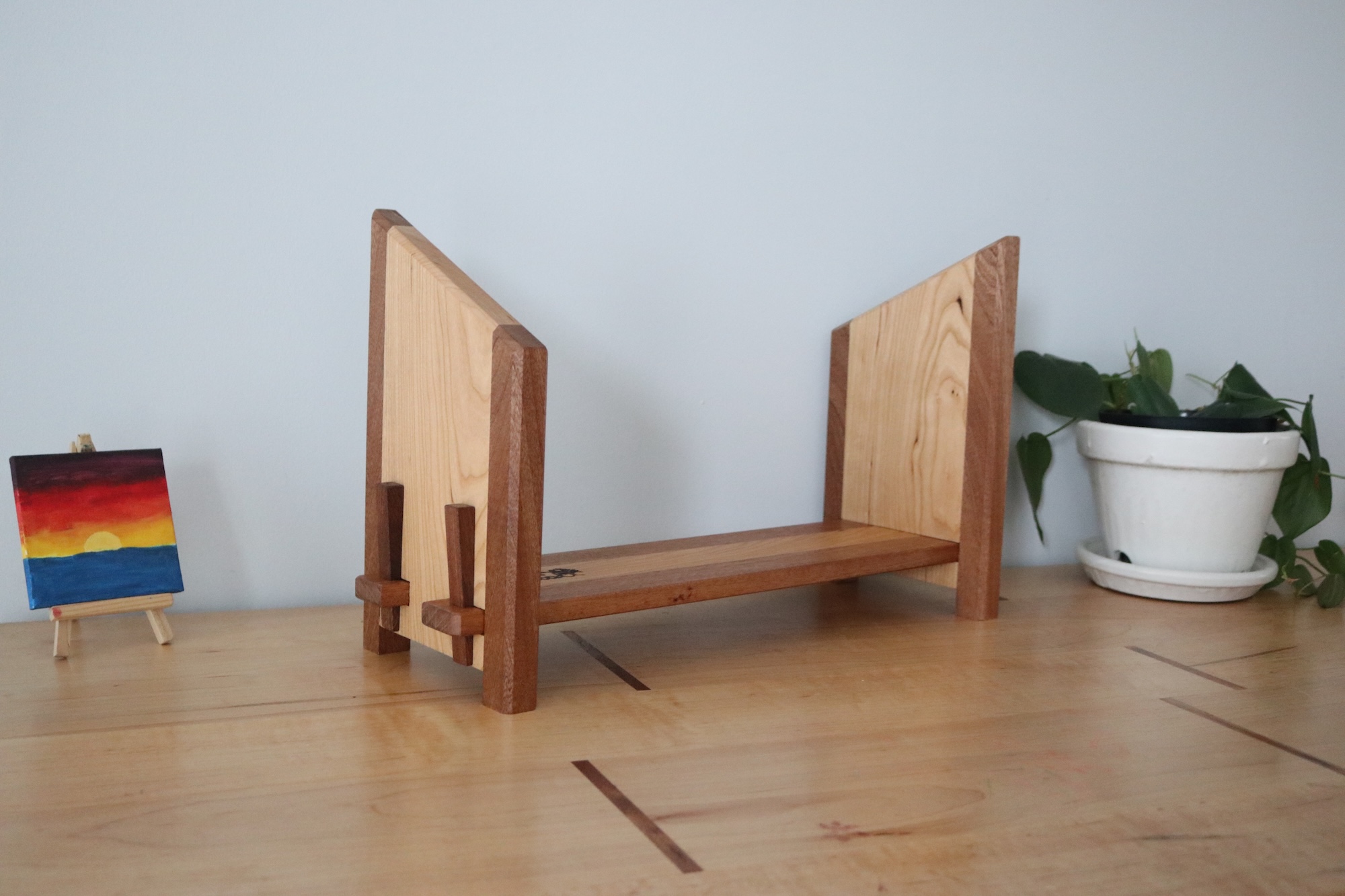Designed for readers who like things tidy—but flexible. This handcrafted tabletop bookshelf features one fixed bookend and one sliding bookend, allowing you to easily adjust the width to fit your current stack of books. Whether you’re organizing a few favorites or a growing collection, this shelf adapts as your needs change.