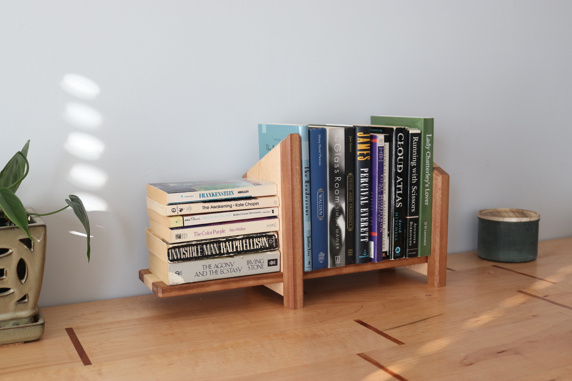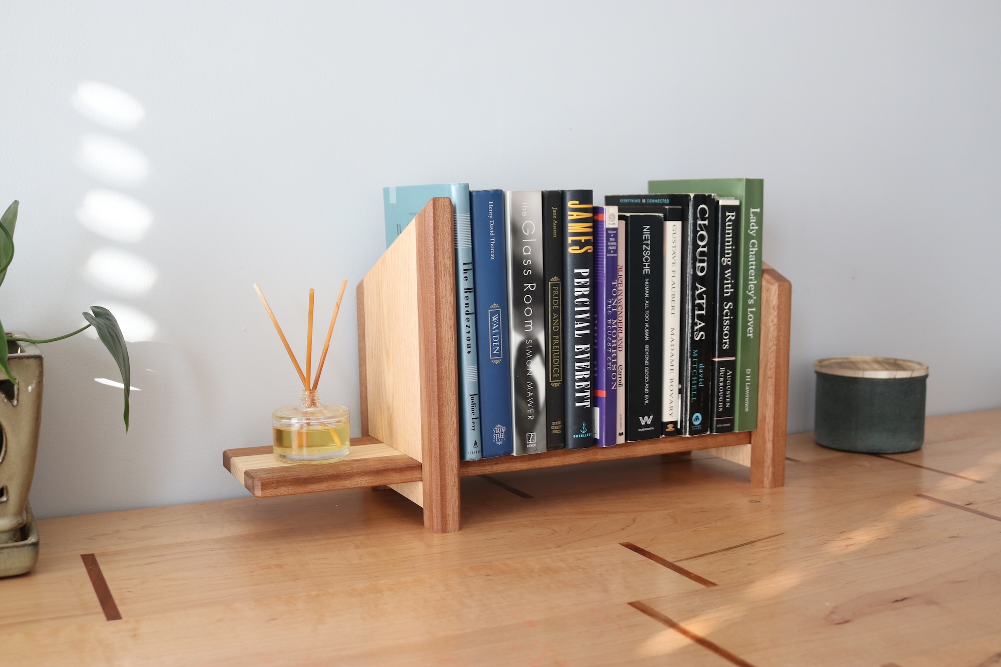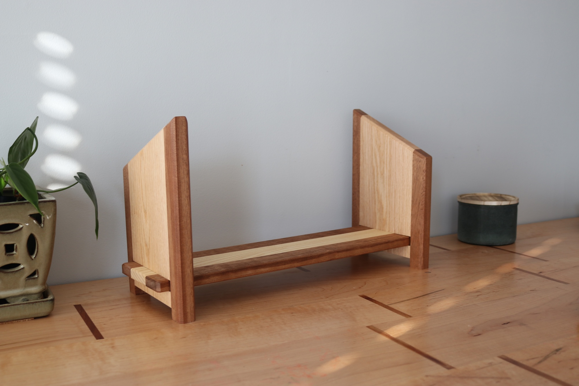 Designed for readers who like things tidy—but flexible. This handcrafted tabletop bookshelf features one fixed bookend and one sliding bookend, allowing you to easily adjust the width to fit your current stack of books. Whether you’re organizing a few favorites or a growing collection, this shelf adapts as your needs change.