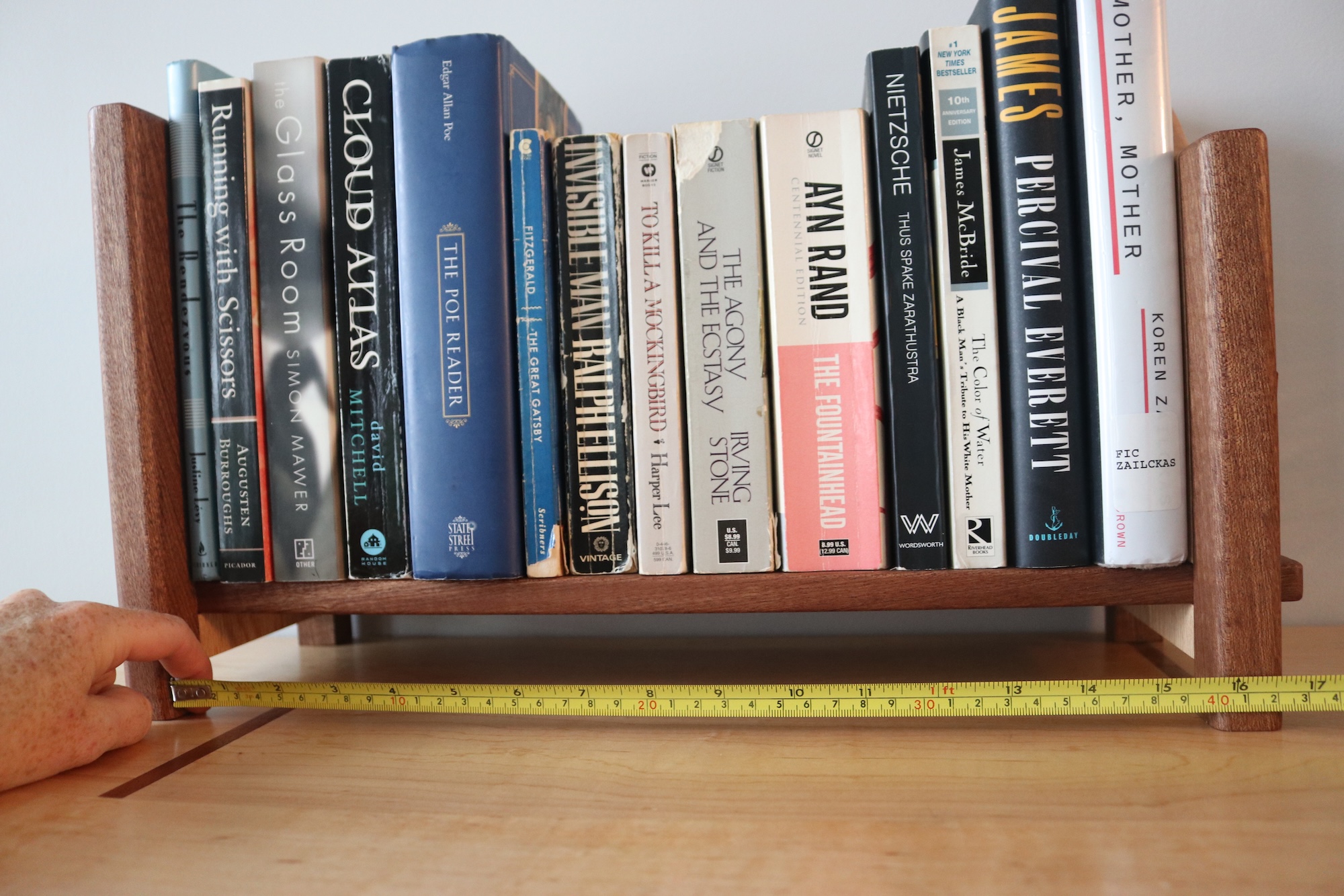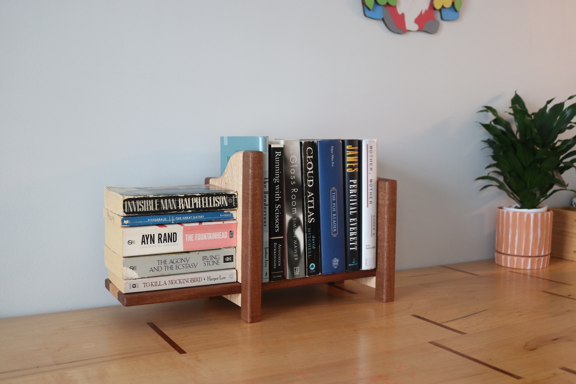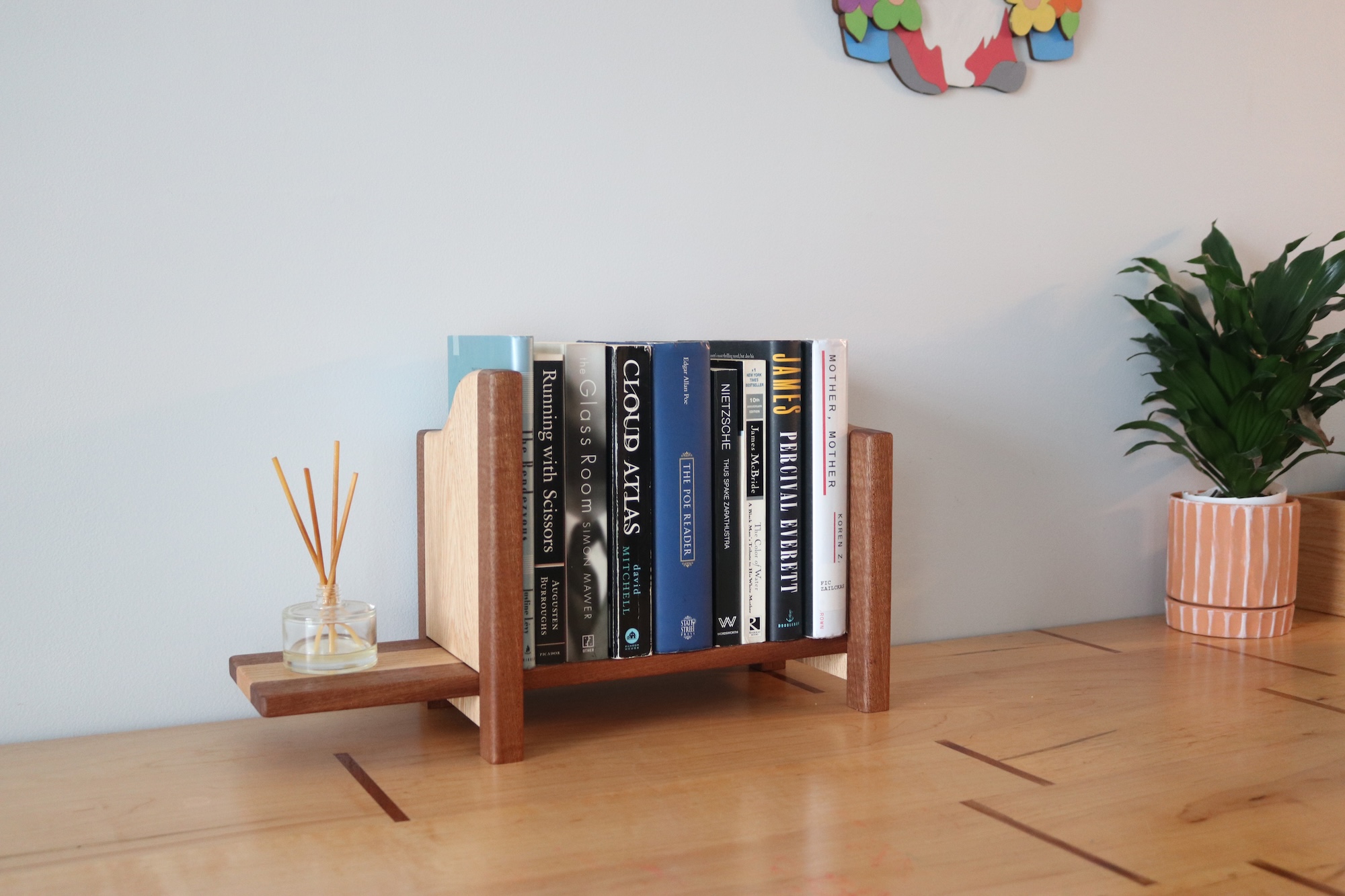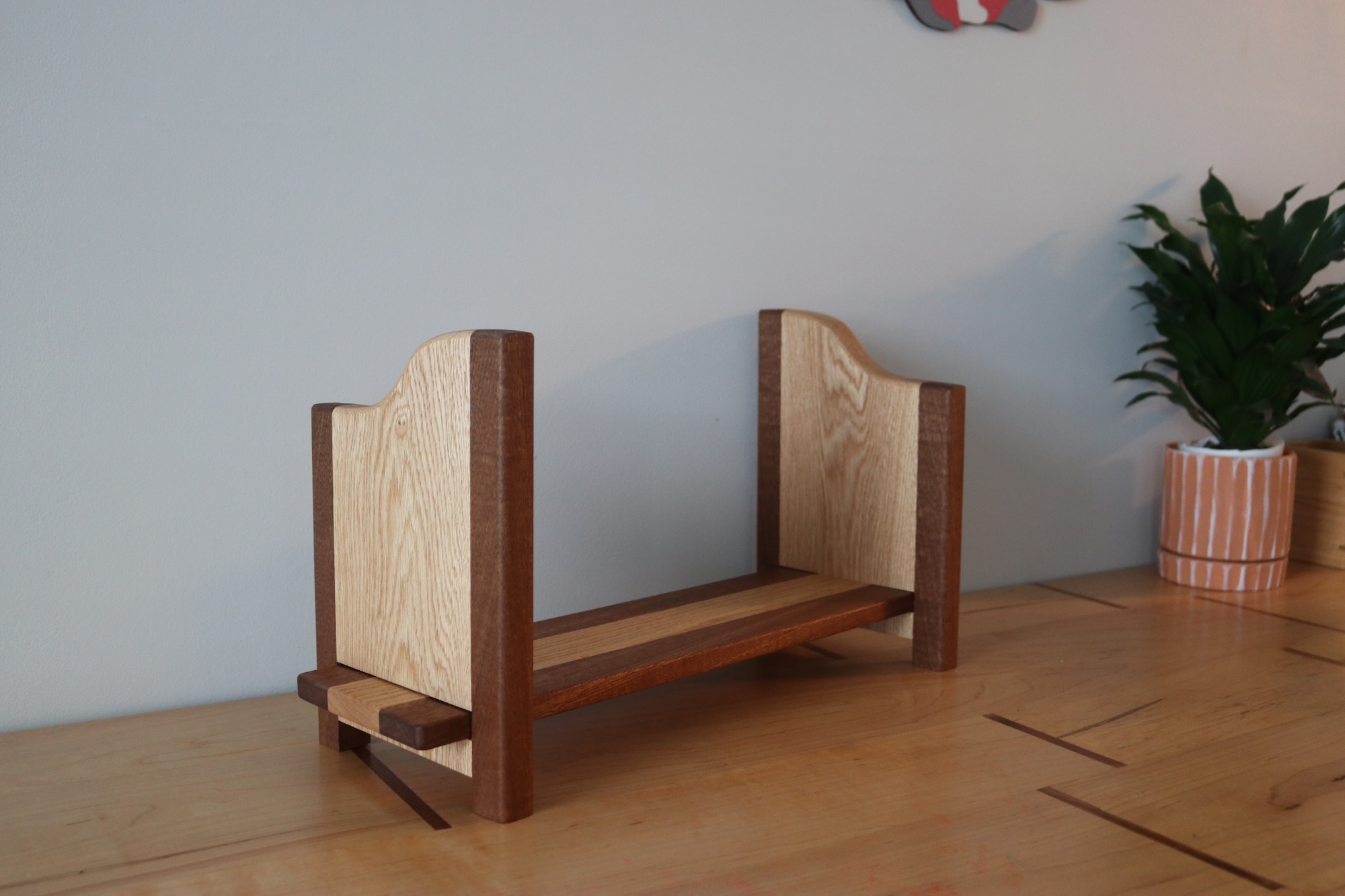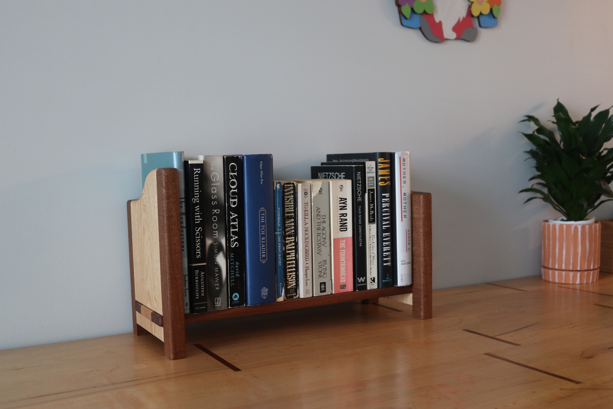 This bookshelf features the beautiful hardwoods Sapele & Red Oak. All of the edges are rounded for a nice, smooth finish. The max width of the area where books will sit is ~15.75″. These shelves are perfect for kid’s rooms, an office or even your kitchen counter. They are finished with several protective finish coats.