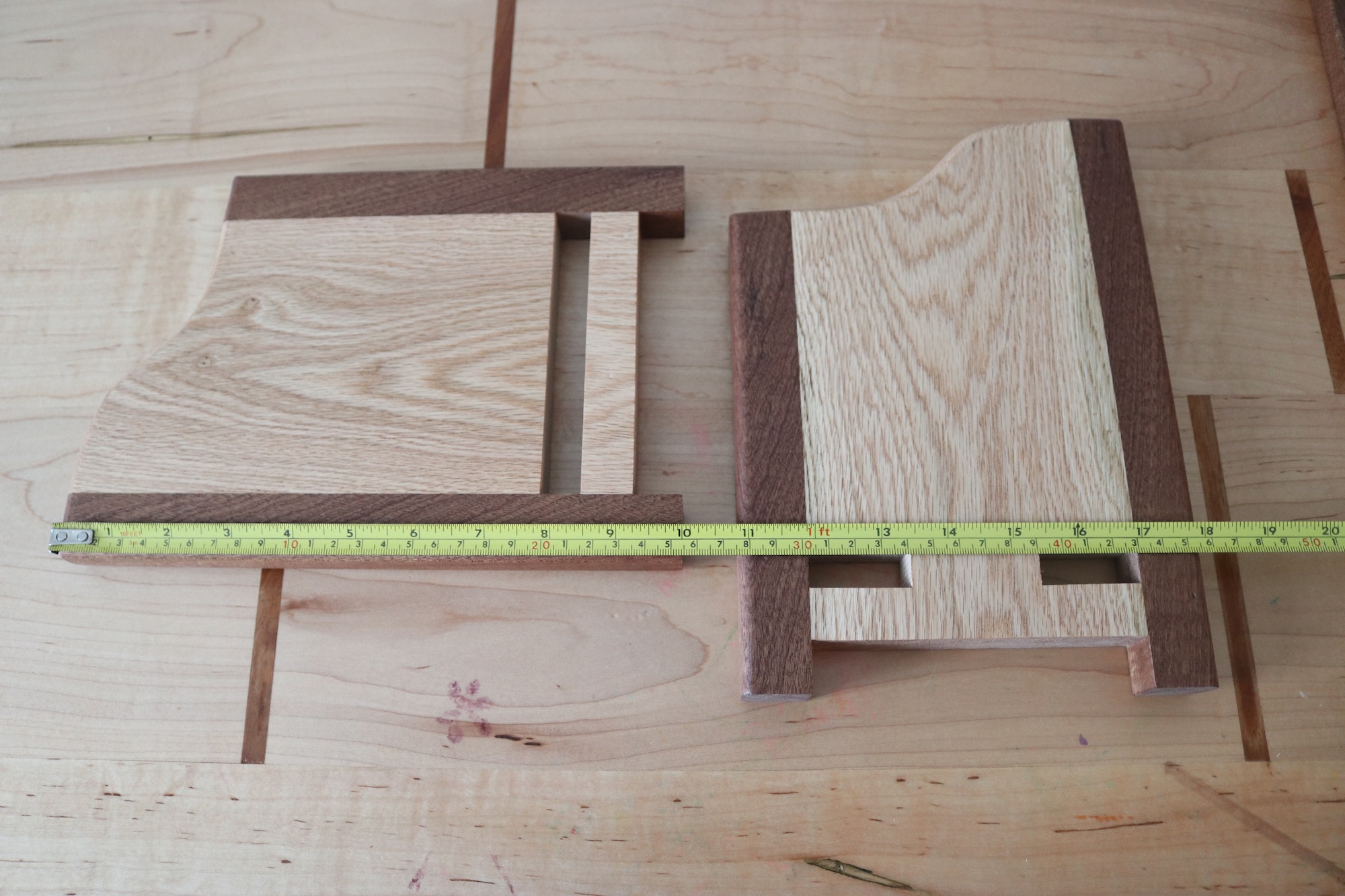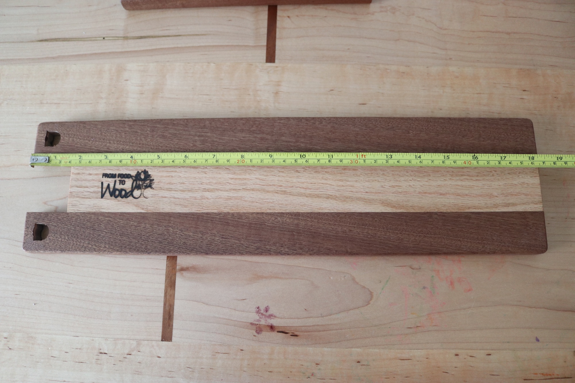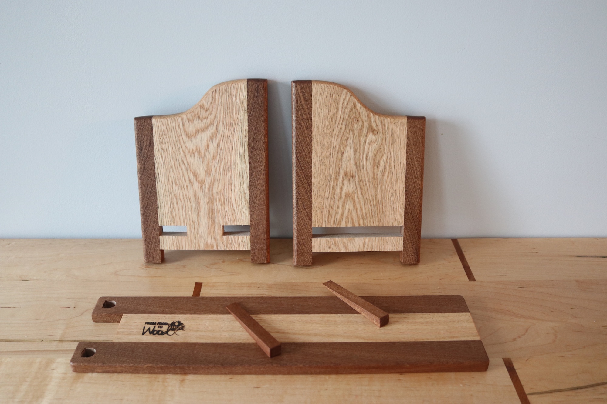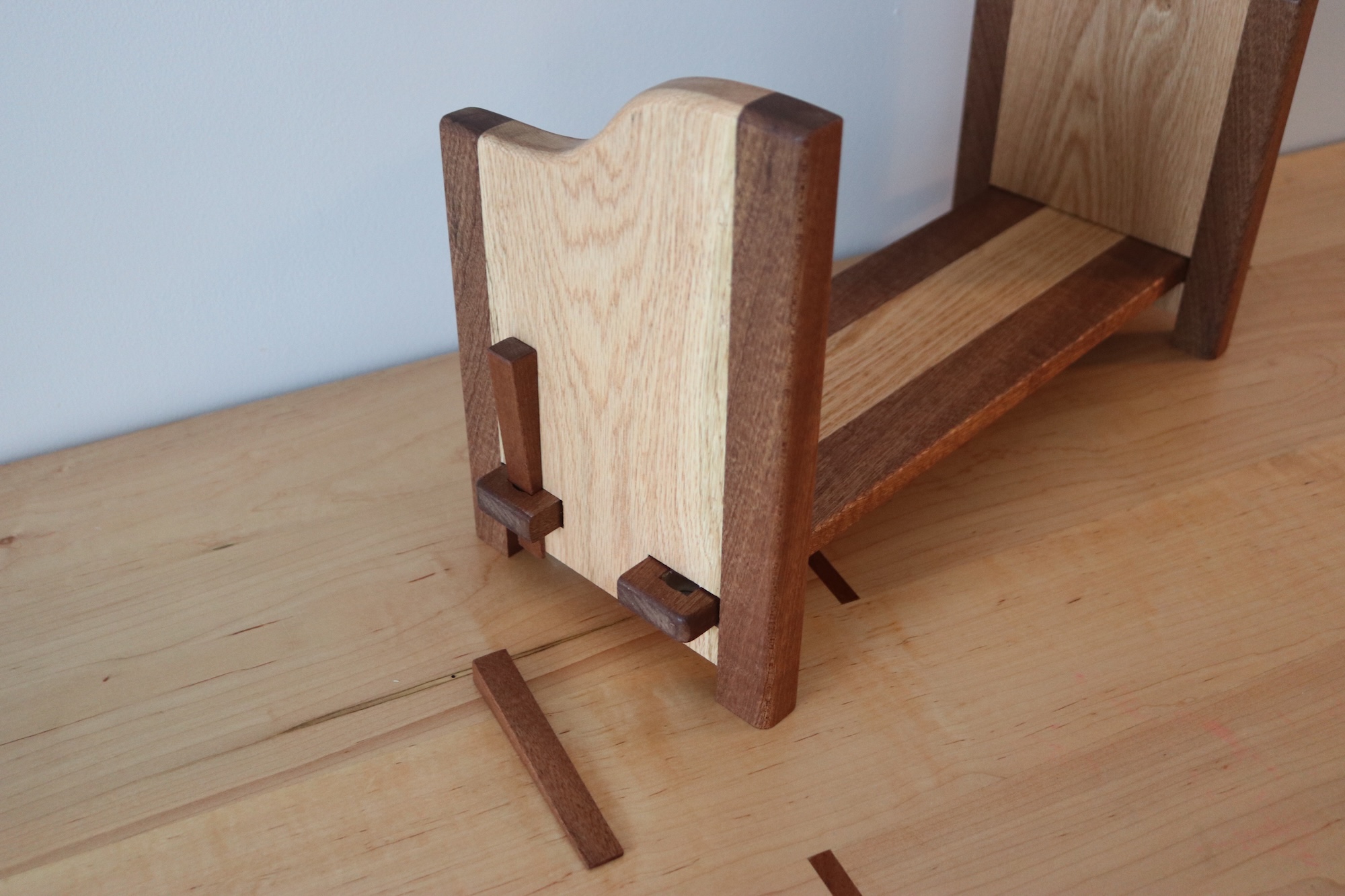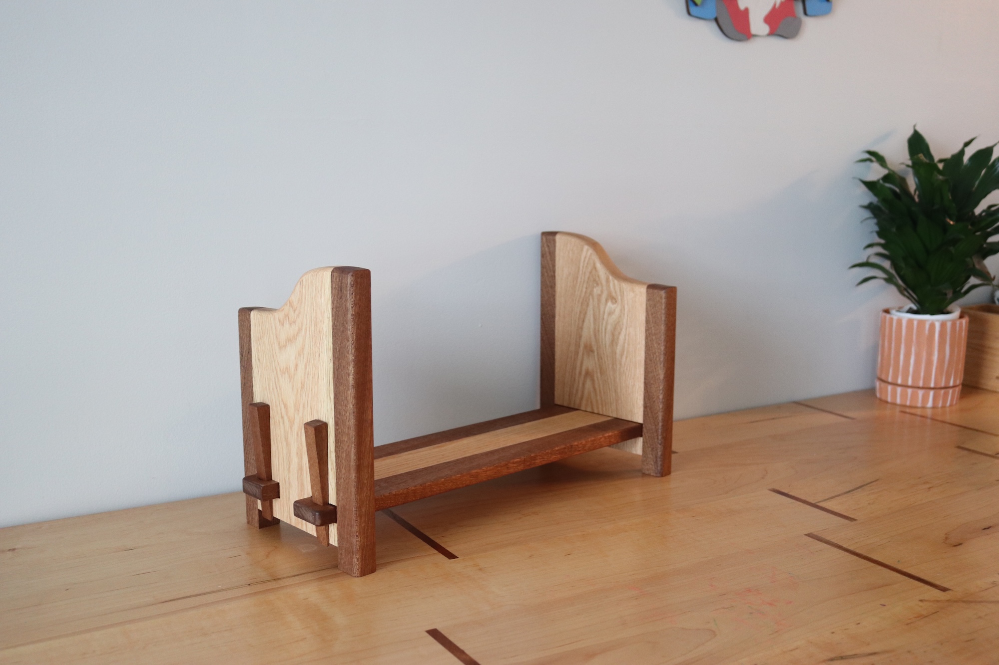 This bookshelf features the beautiful hardwoods Sapele & Red Oak. All of the edges are rounded for a nice, smooth finish. The max width of the area where books will sit is ~15.75″. These shelves are perfect for kid’s rooms, an office or even your kitchen counter. They are finished with several protective finish coats.