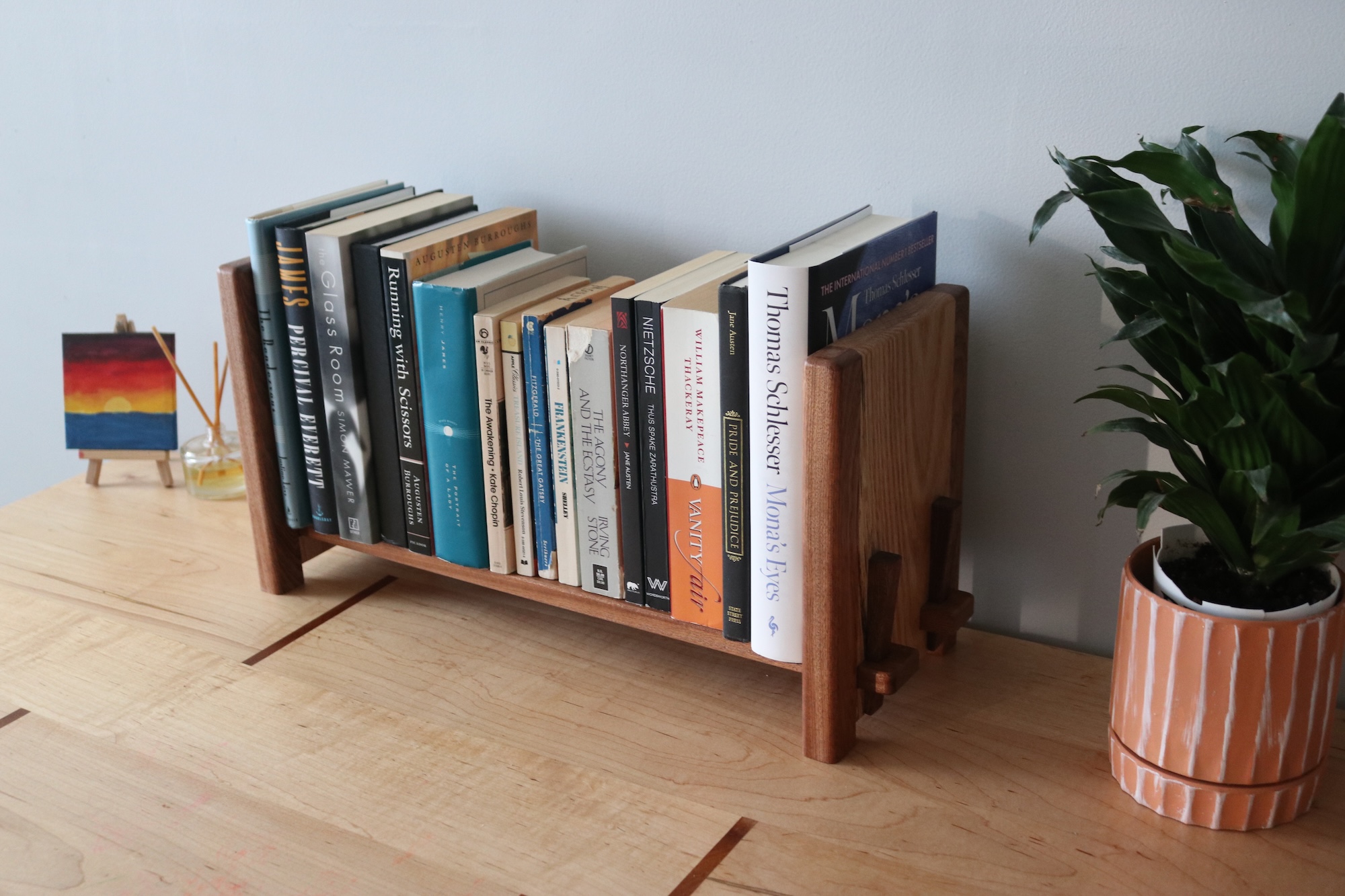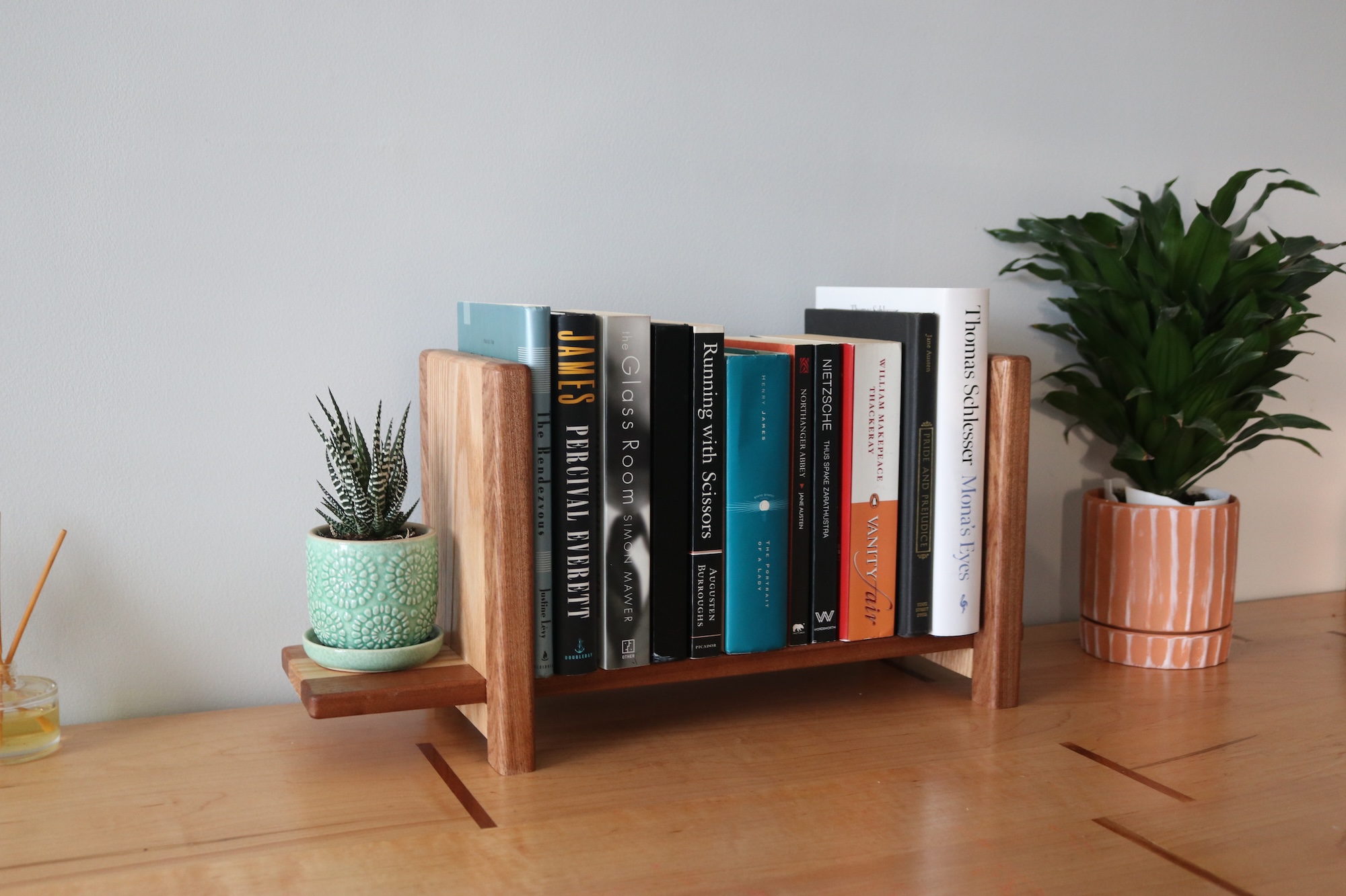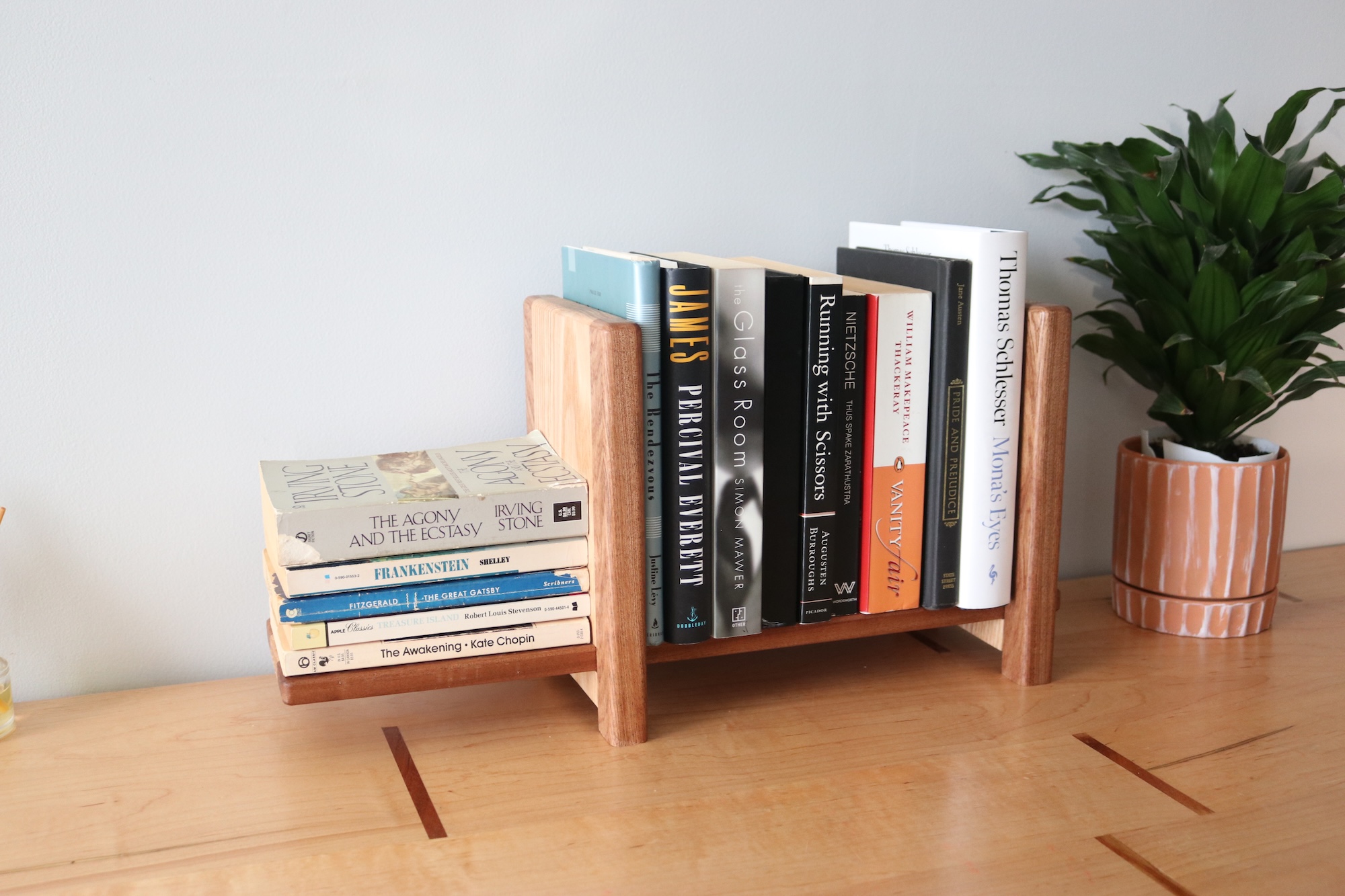 Designed for readers who like things tidy—but flexible. This handcrafted tabletop bookshelf features one fixed bookend and one sliding bookend, allowing you to easily adjust the width to fit your current stack of books. Whether you’re organizing a few favorites or a growing collection, this shelf adapts as your needs change.