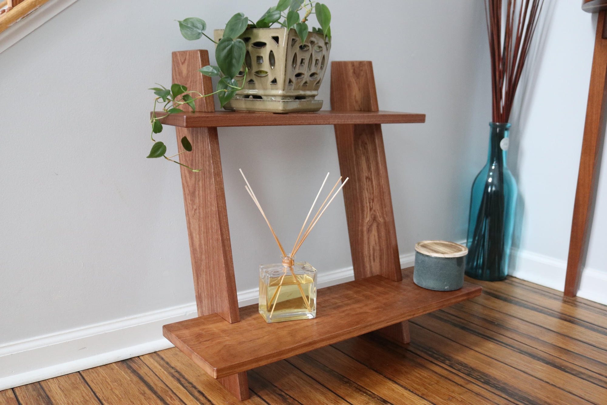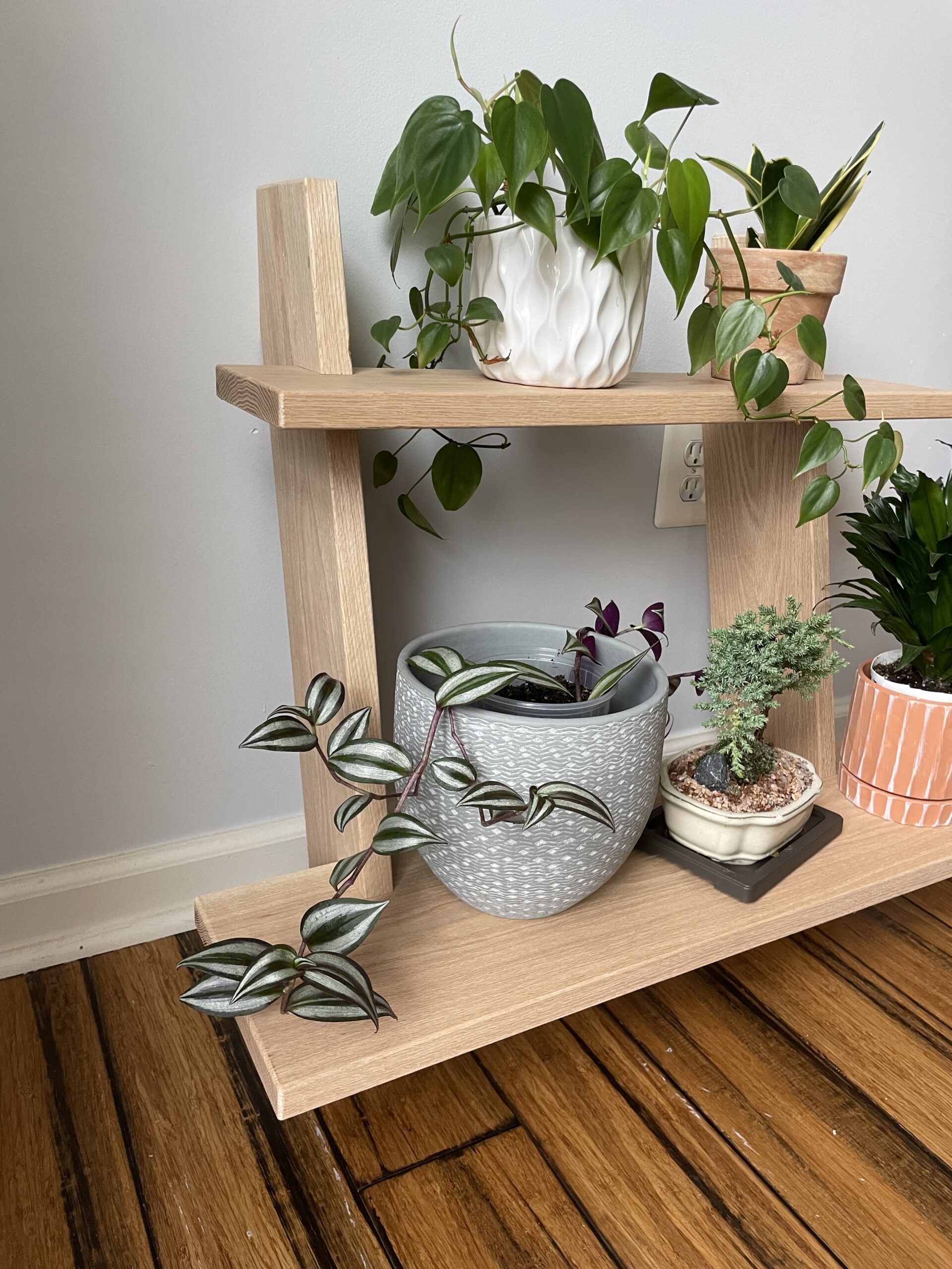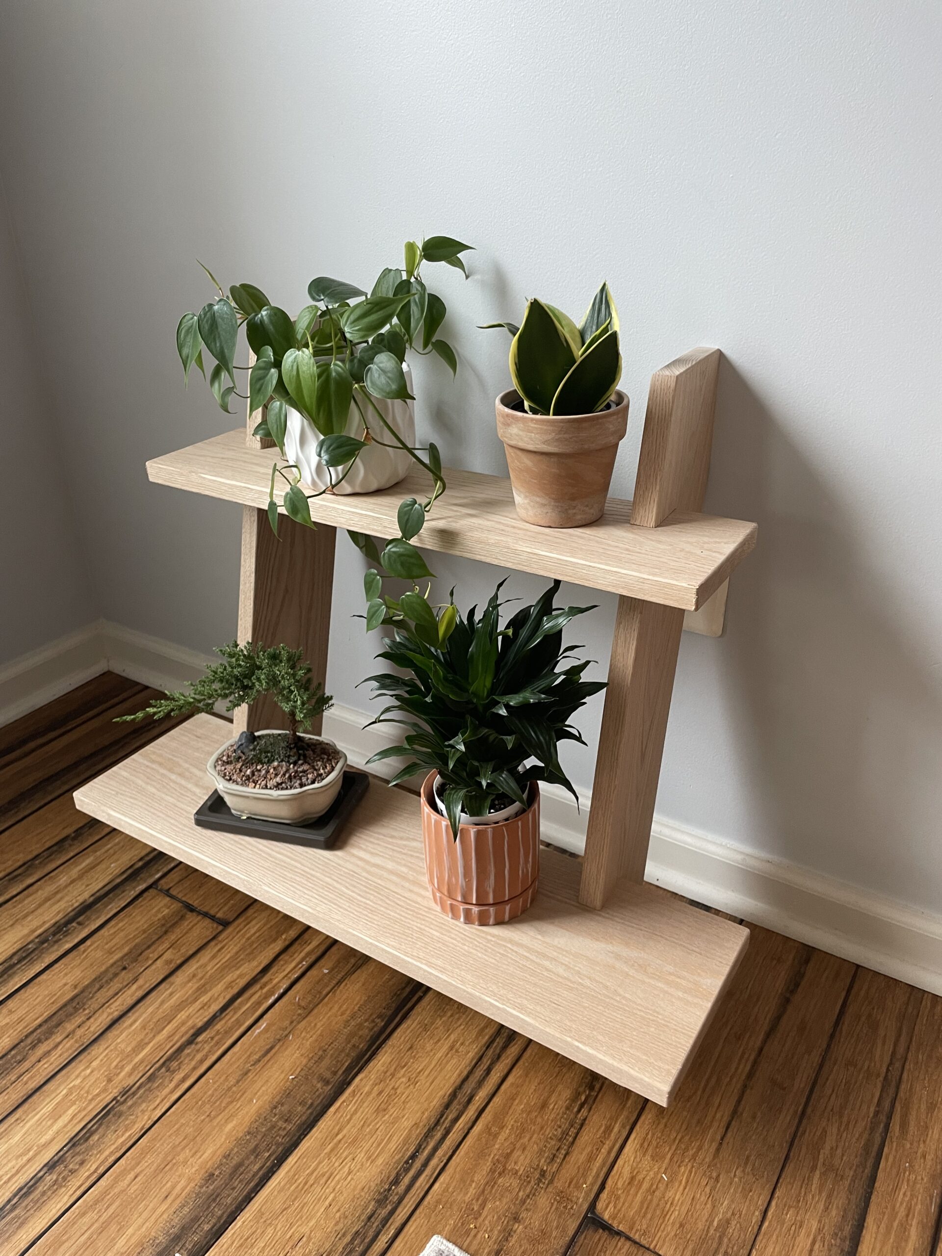 This handcrafted leaning plant stand is designed to rest securely against the wall while adding vertical interest and functional plant storage—without taking up much floor space.