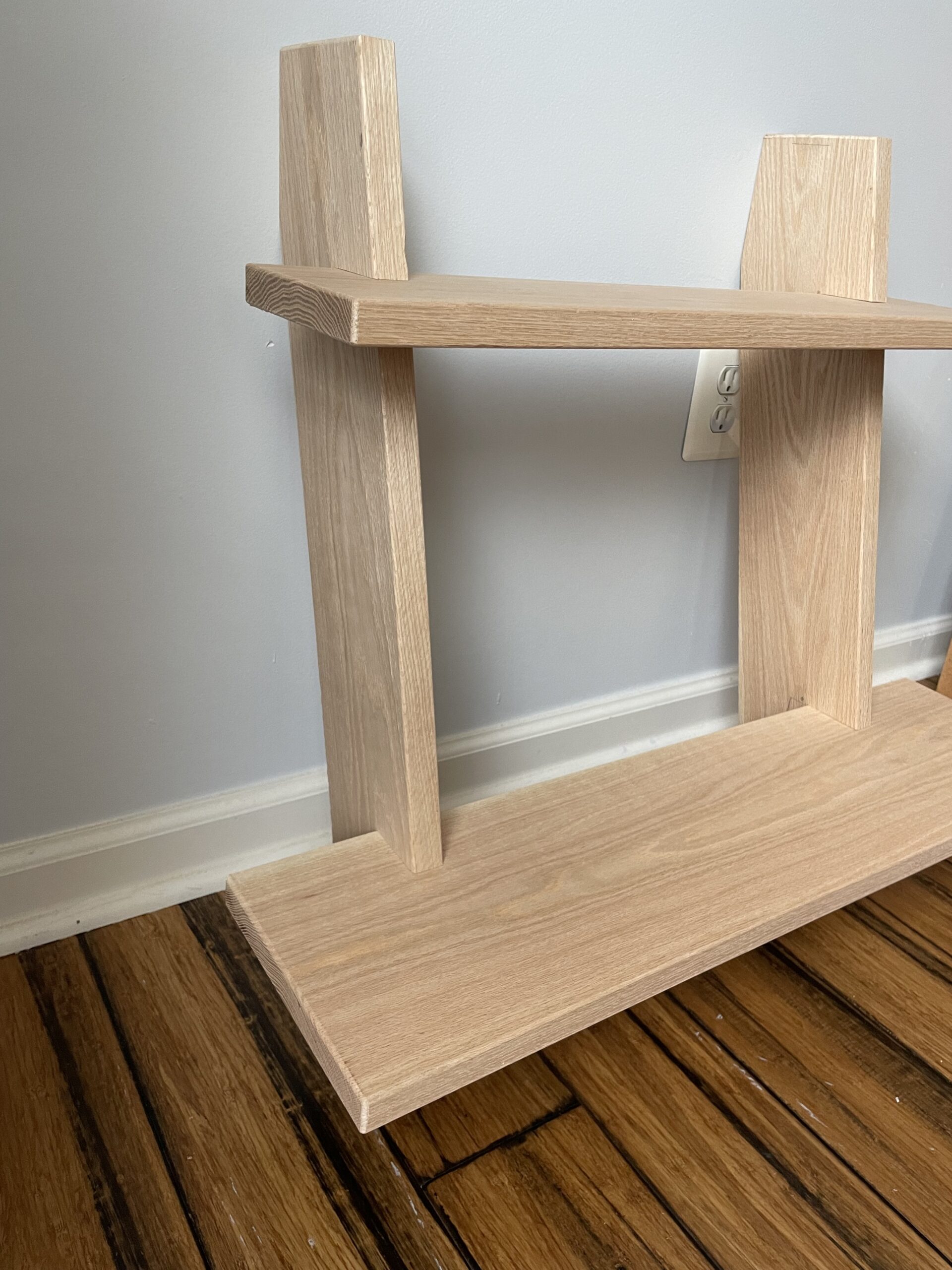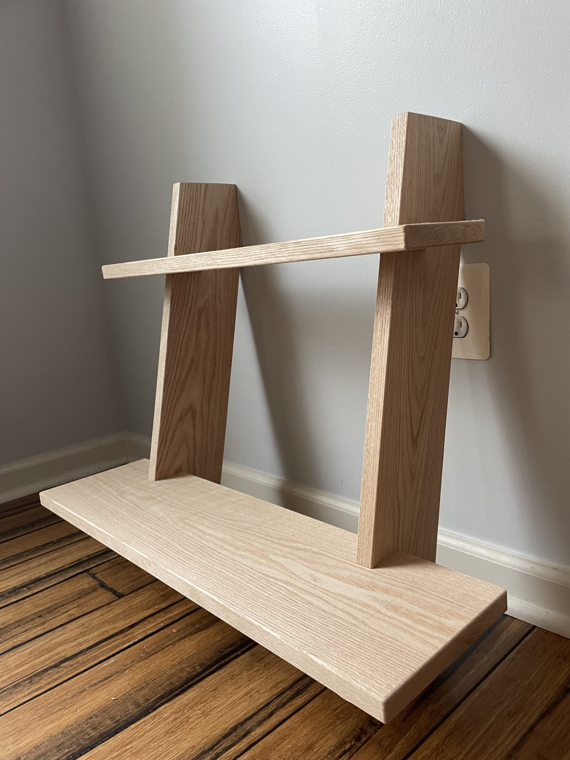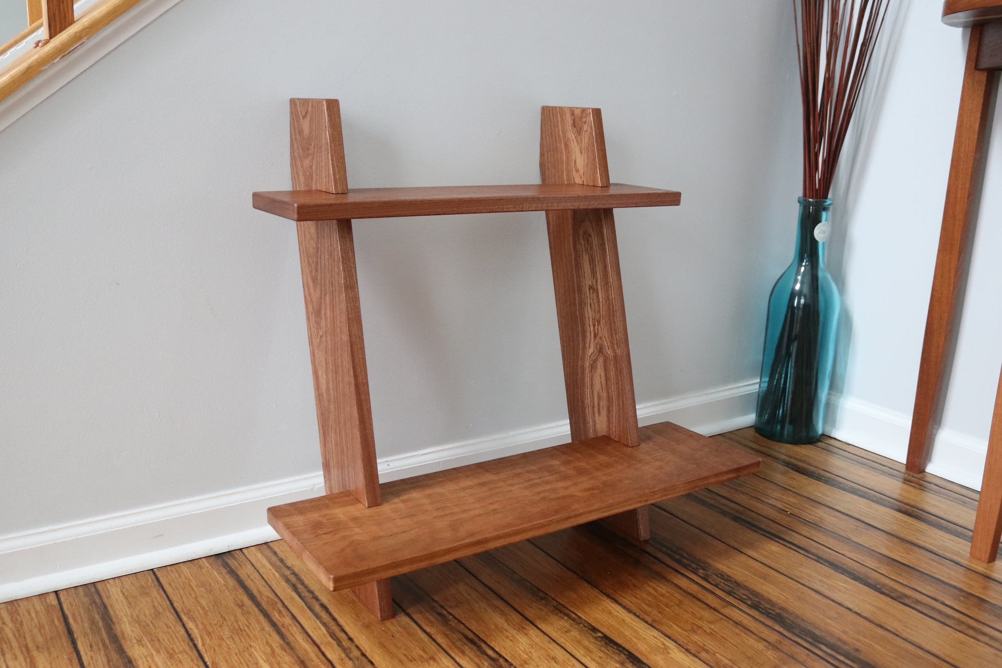 This handcrafted leaning plant stand is designed to rest securely against the wall while adding vertical interest and functional plant storage—without taking up much floor space.