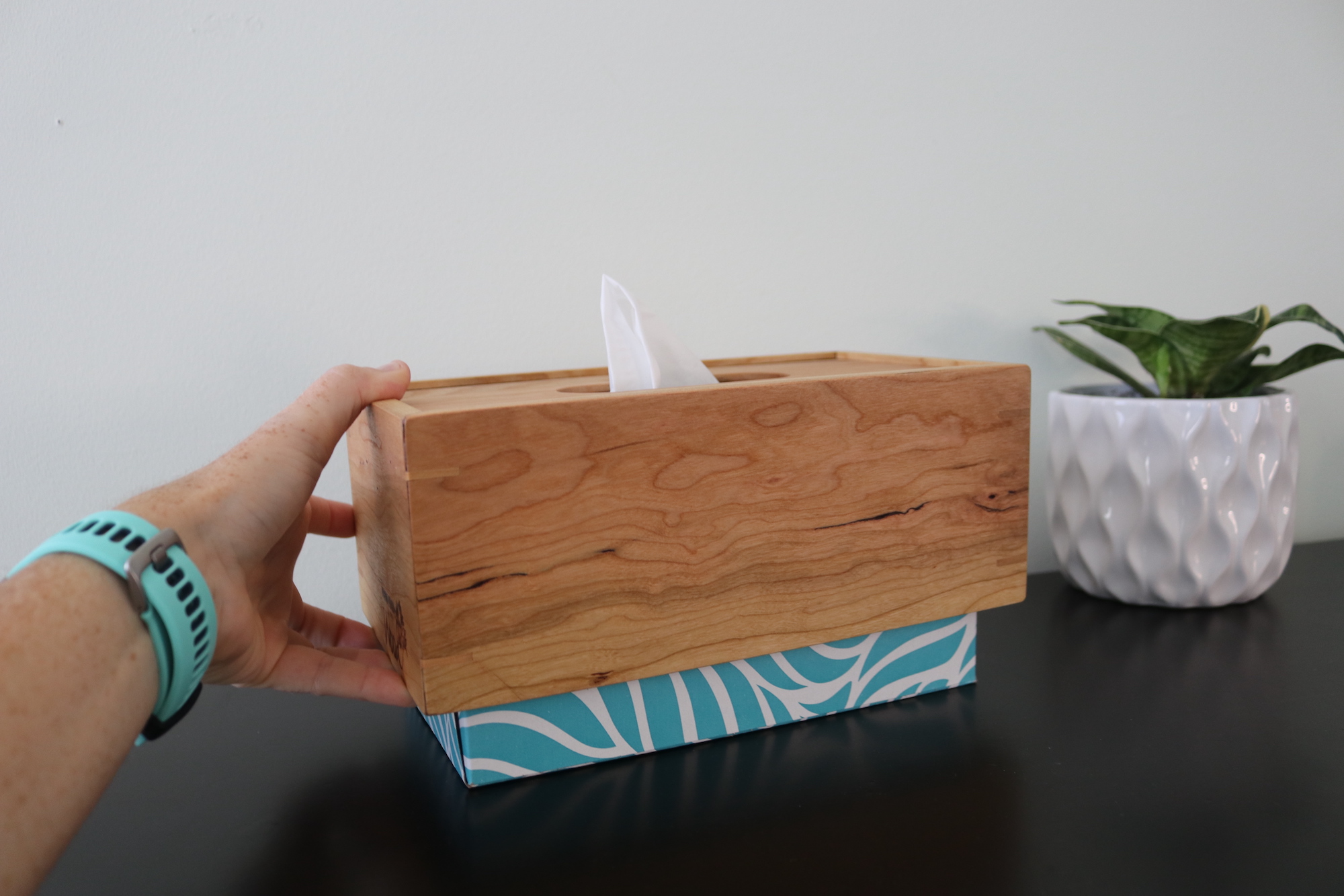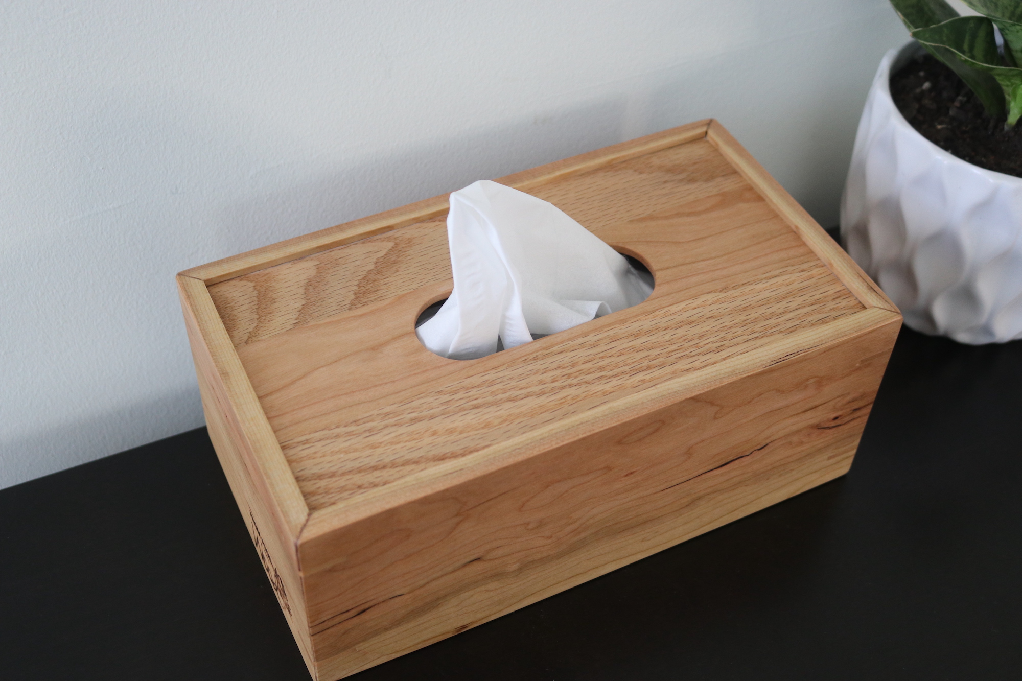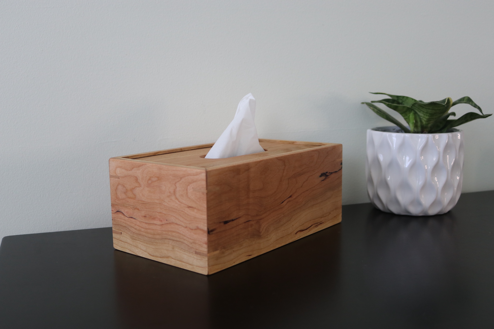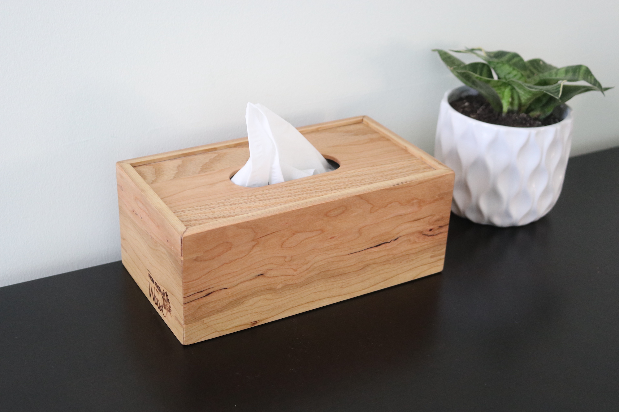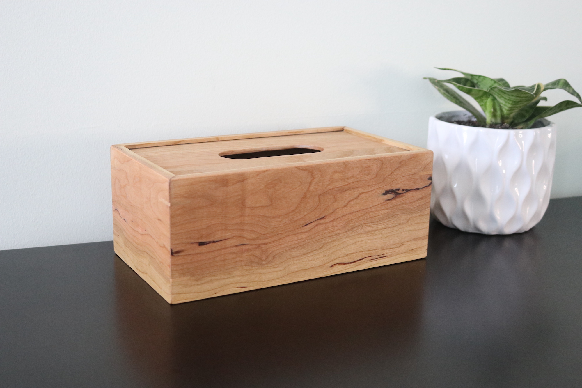 This hardwood tissue box cover offers a unique touch to any living space. This cover is made with the beautiful hardwood Cherry with an accent pieces of Red Oak in the top. This box is finished smooth with several protective varnish coats.