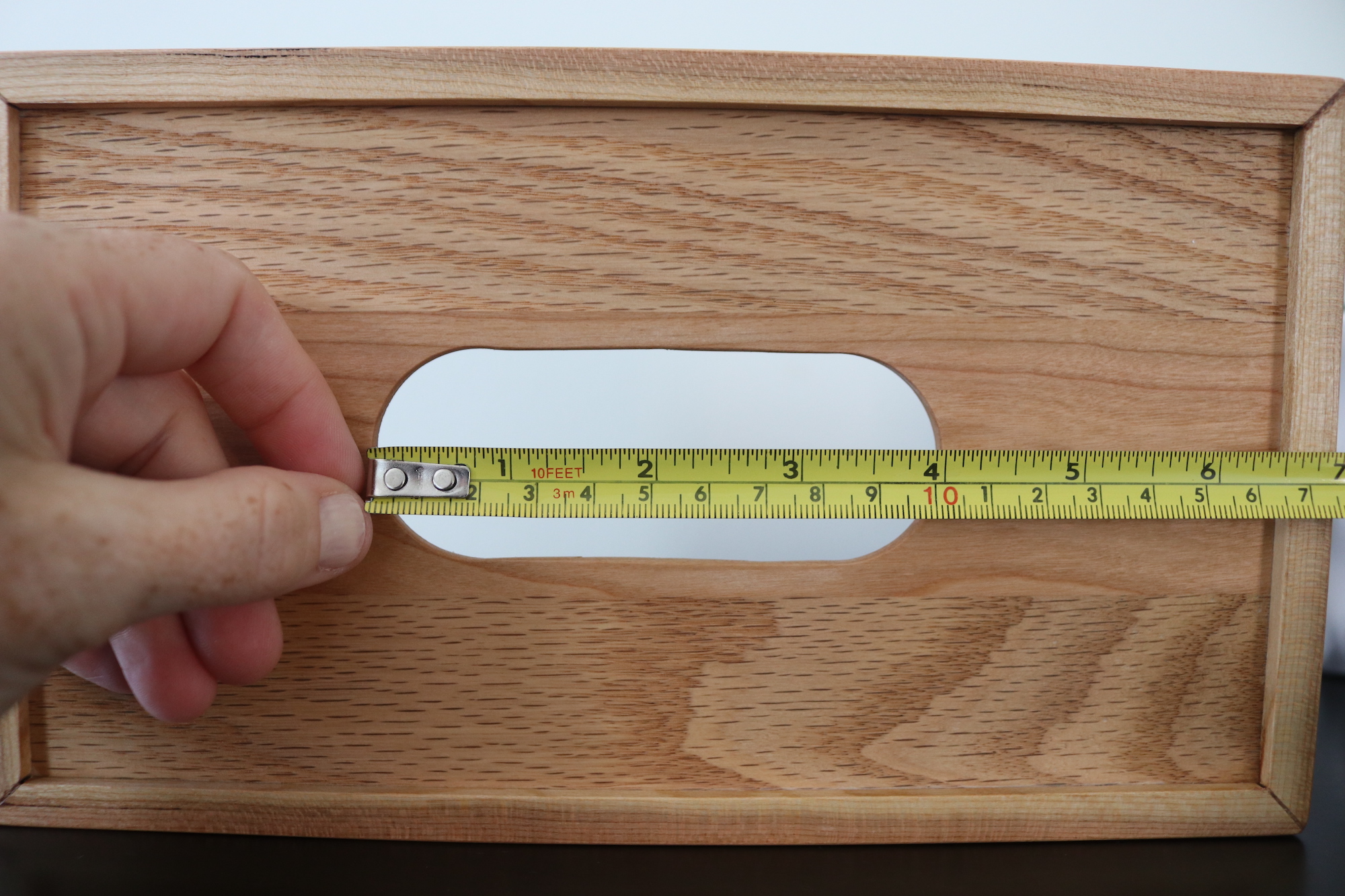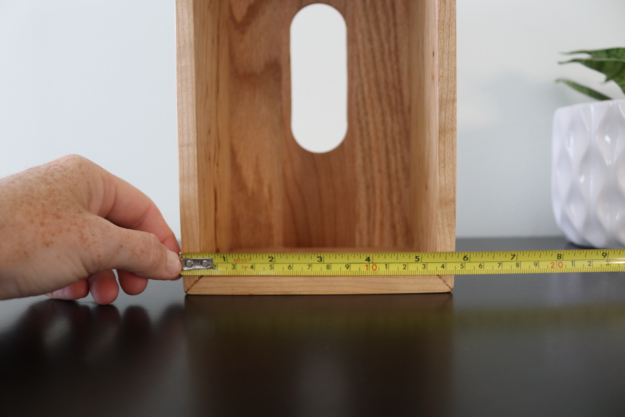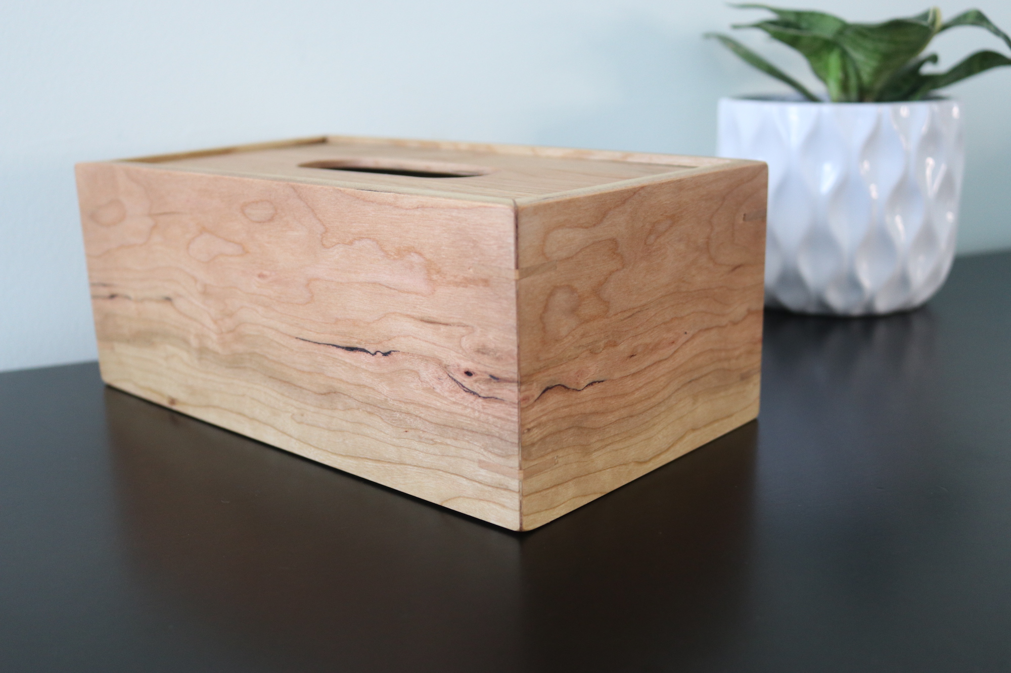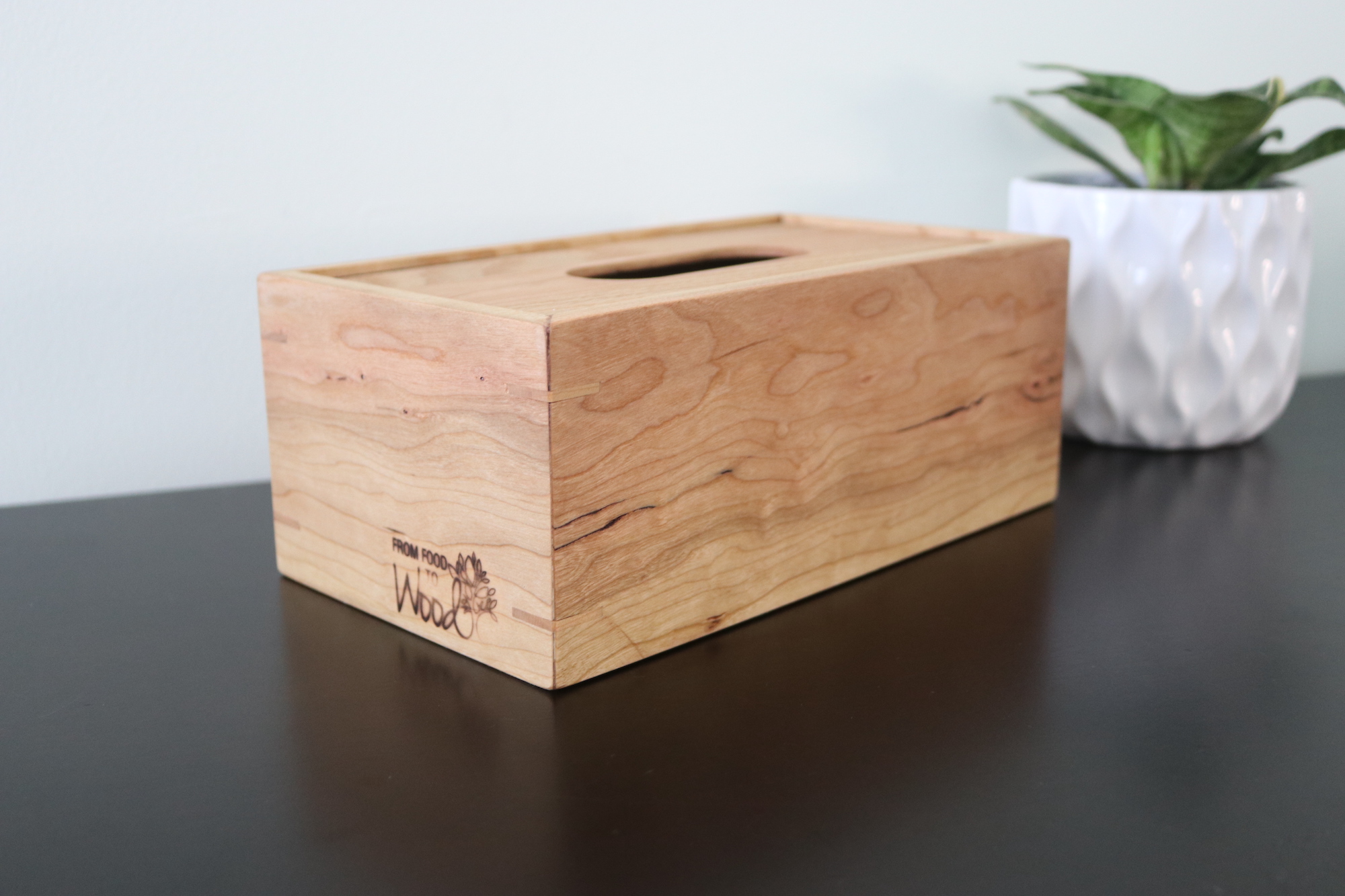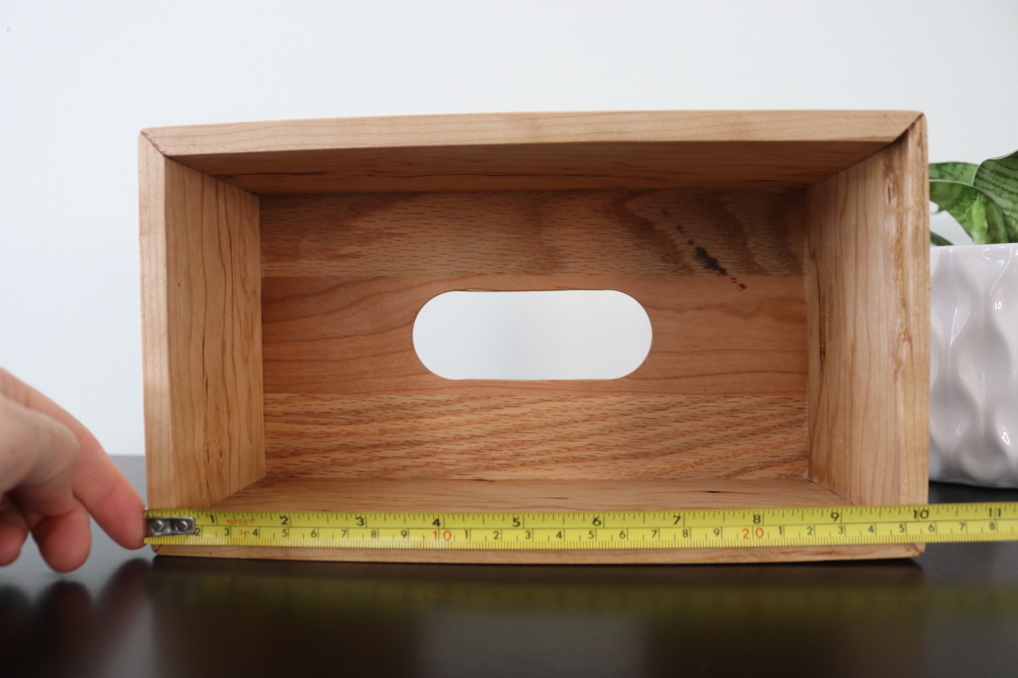This hardwood tissue box cover offers a unique touch to any living space. This cover is made with the beautiful hardwood Cherry with an accent pieces of Red Oak in the top. This box is finished smooth with several protective varnish coats.