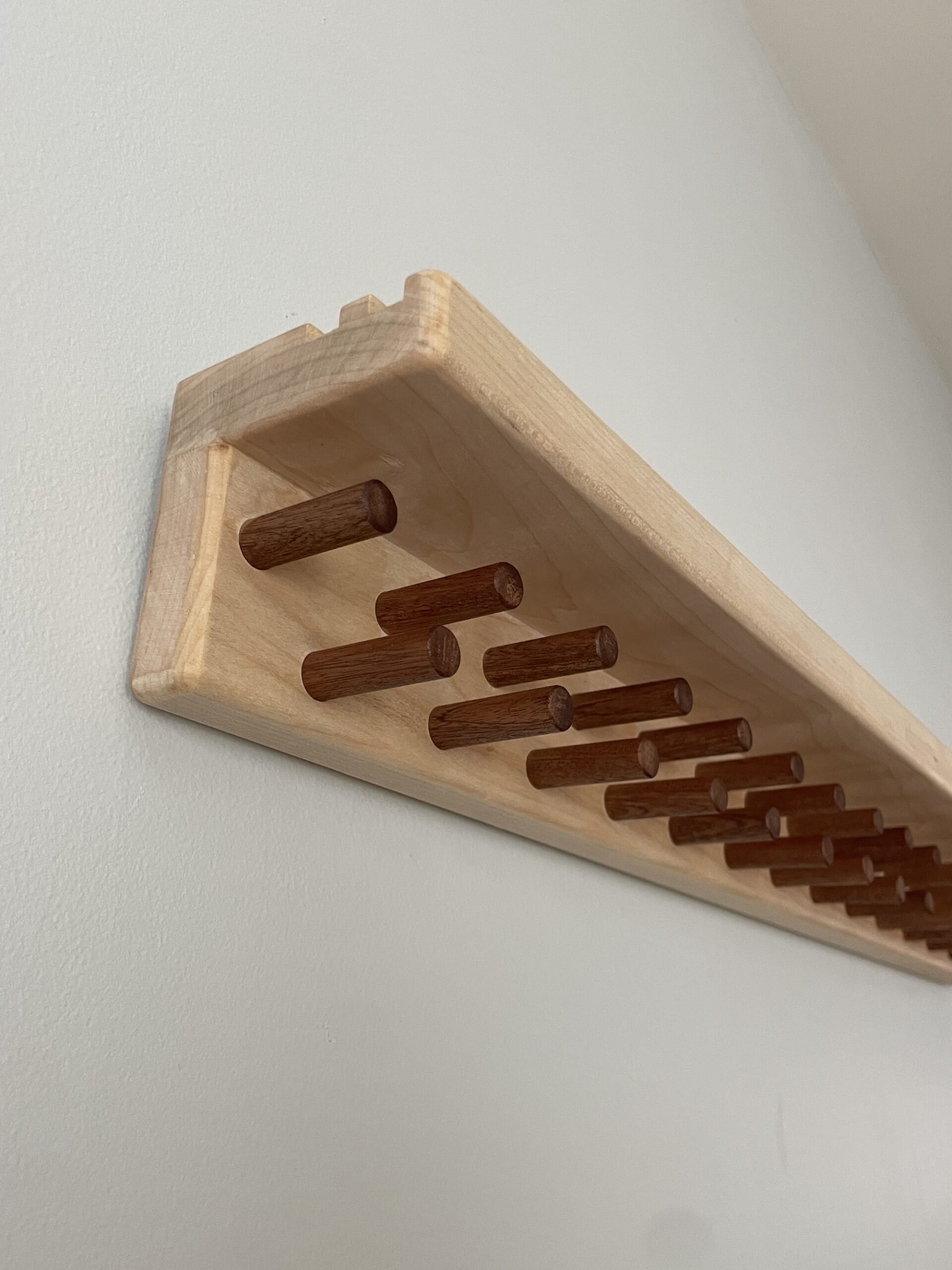Slat-style headboard made from many beautiful hardwoods including Purple Heart, Walnut, Padauk, Maple, Oak and Cherry